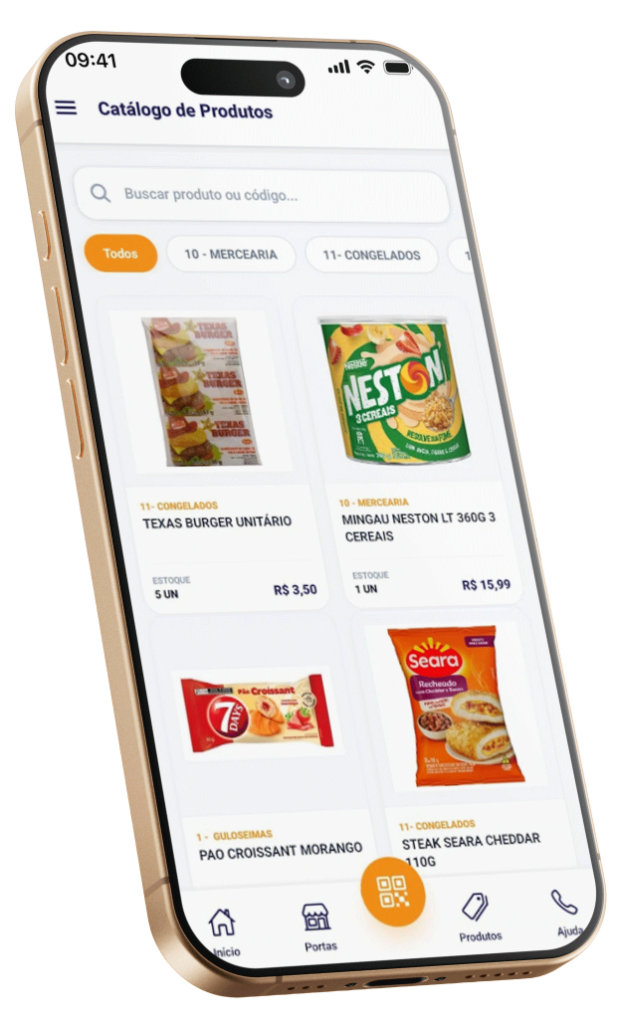 Produtos, preços, promoções e estoques são configurados na gestão e aparecem instantaneamente no PDV e no app do cliente.